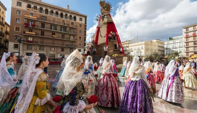 Among the acts, the Offering of Flowers to the Virgin of the Helpless is notable, in which festival-goers come dressed in Valencian regional attire. Since the 16th century, some elements of Valencian regional costumes, inspired by the clothing of farmers, have been made from silk: skirts, fans, corsets, aprons, headscarves, etc. for women and shirts, stockings, sashes, waistcoats, smocks, etc. for men.